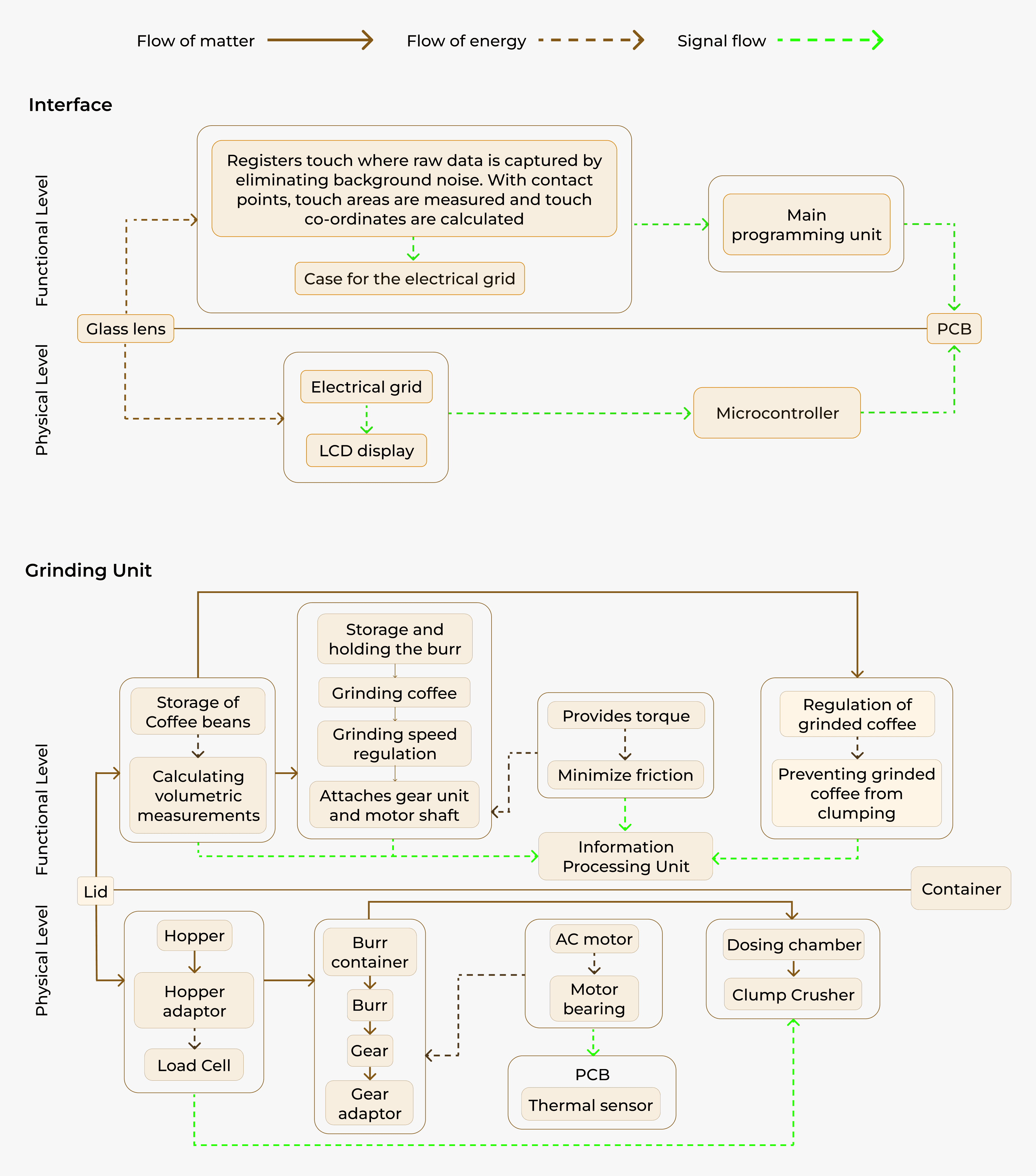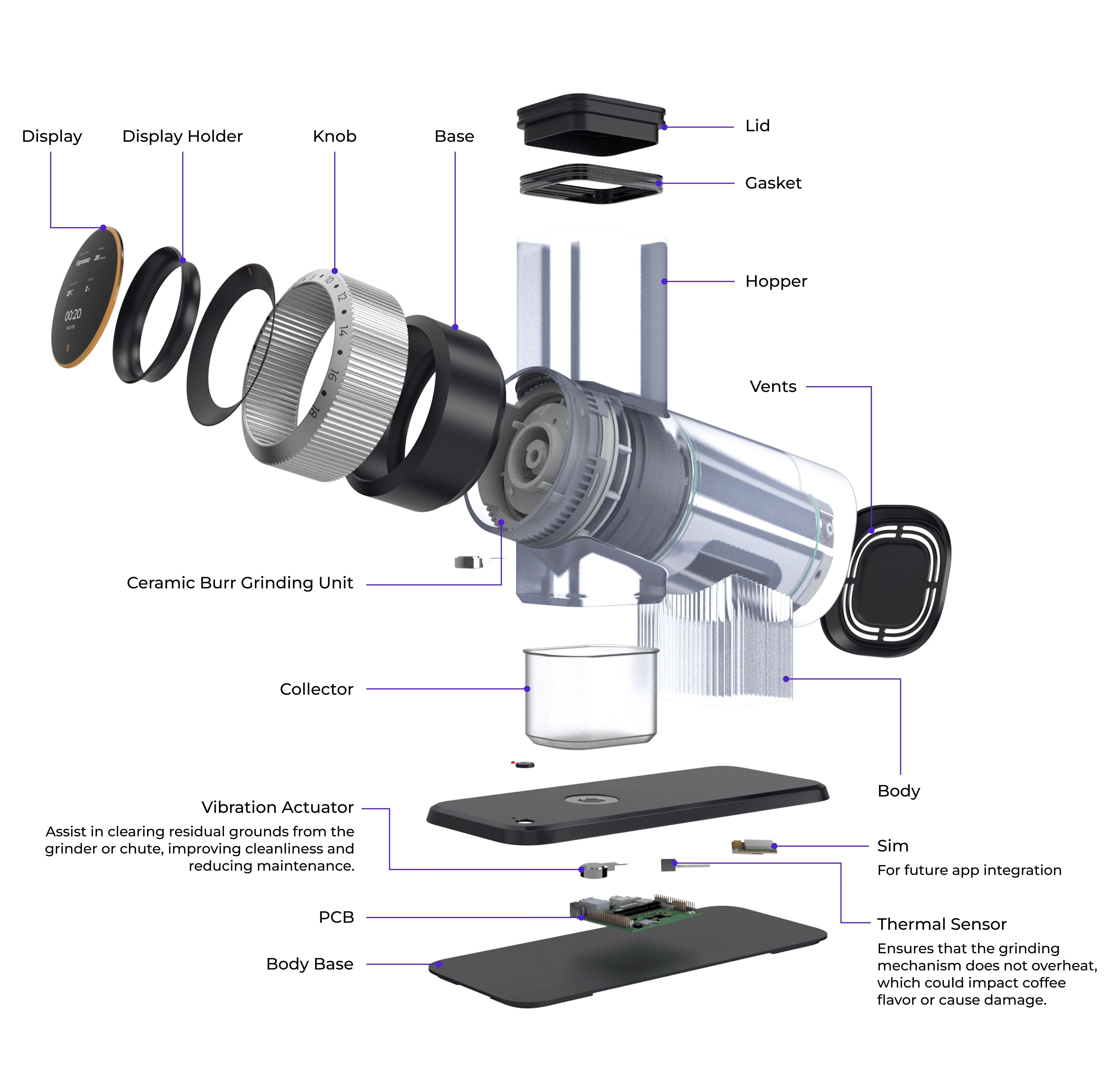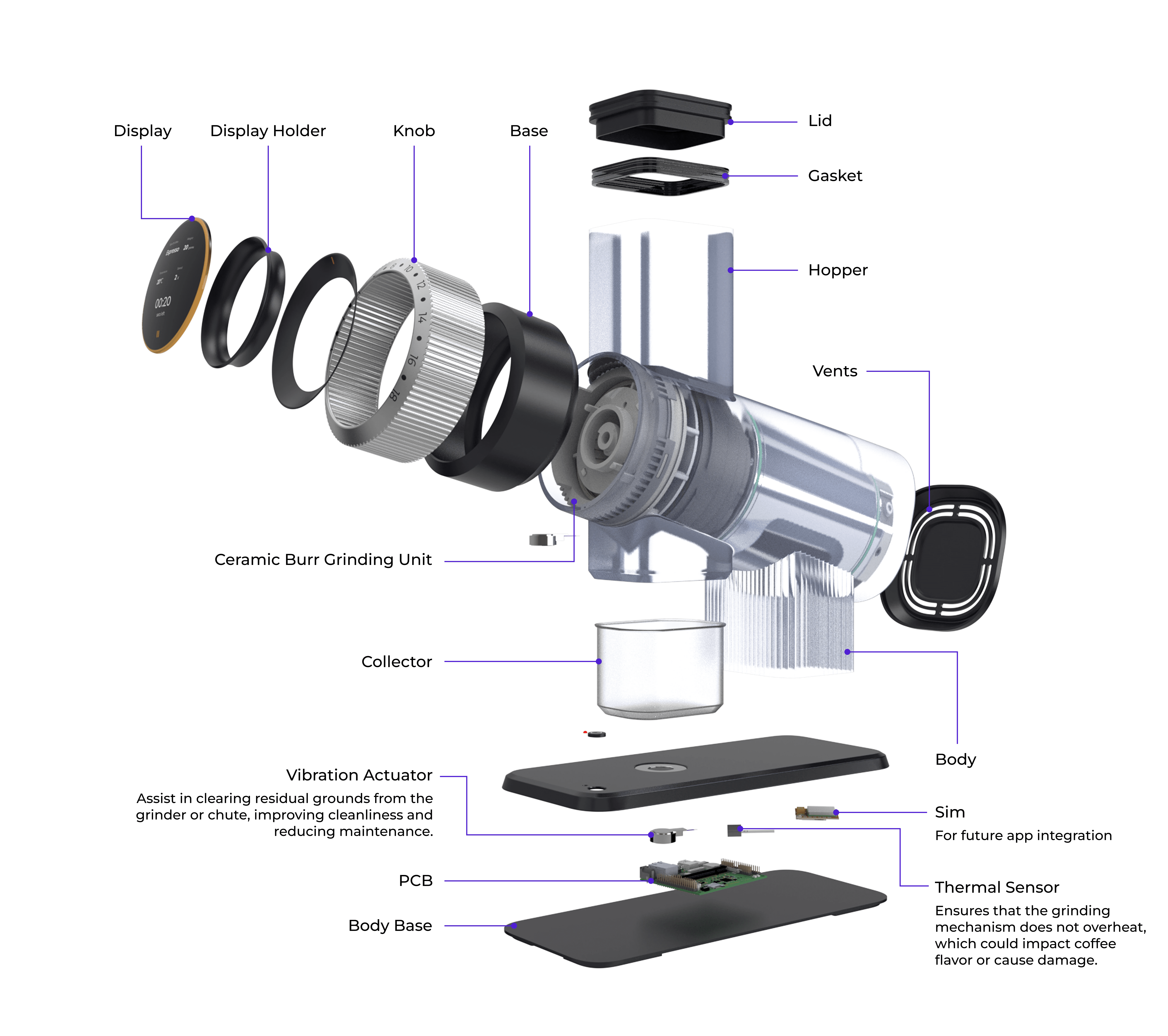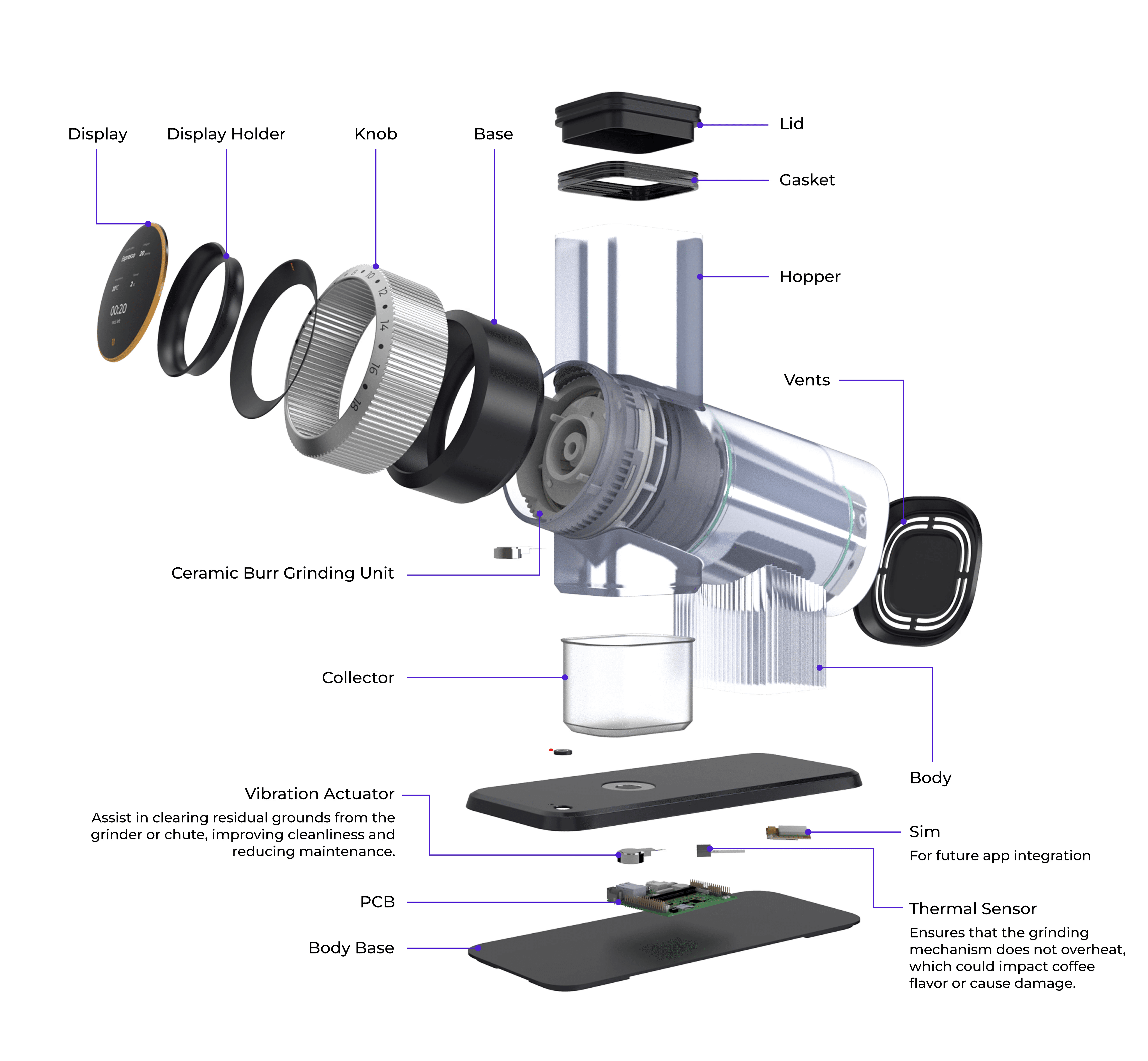 This project explores a fully automatic, smart coffee grinder designed for fast-paced commercial environments. It efficiently handles multiple user requests in a queue while delivering consistent grind quality through high-performance burrs, static reduction, and overheating prevention. With an intuitive interface and low-maintenance design, the grinder prioritizes speed, reliability, and long-term durability.